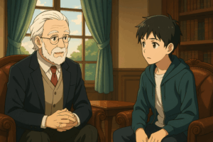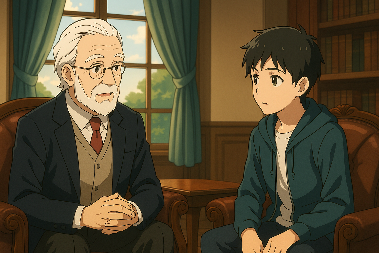 主人公は中学2年生の少年・優斗。ある雨の日、謎めいた女性・七海に導かれ、とある洋館へと足を踏み入れます。そこには「ボス」と呼ばれる大富豪が住んでおり、「この屋敷の価値がわかる者に譲る」と言いながら、優斗に“お金の謎”を問う講義を始めます。