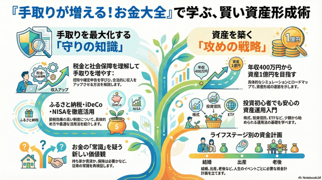 特に、税金や社会保障制度の仕組みを理解することで、合法的に手取りを増やせるという視点は目から鱗でした。これまで何となく払っていた税金や保険料について、しっかりと向き合う必要性を痛感しました。