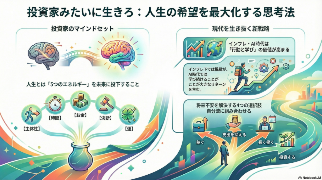 本書は投資家的思考を人生全般に応用するという独創的なコンセプトで、読者に新しい視座を提供する優れた一冊です。5つのエネルギー(主体性・時間・お金・決断・運)というフレームワークは分かりやすく、実践的です。特に増補版として、インフレ×AI時代という現代的な文脈を加えた点は高く評価できます。
