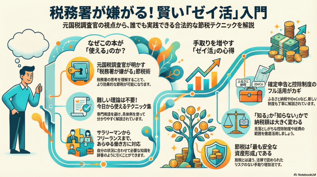 本書は、税金に関する実用書として非常に完成度の高い作品です。最大の魅力は、元国税調査官という著者の立場から語られる「税務署側の視点」が盛り込まれている点でしょう。一般的な節税本では触れられない、税務署が本当に嫌がる(=納税者にとって効果的な)合法的節税方法が具体的に紹介されており、実践的価値が非常に高いです。