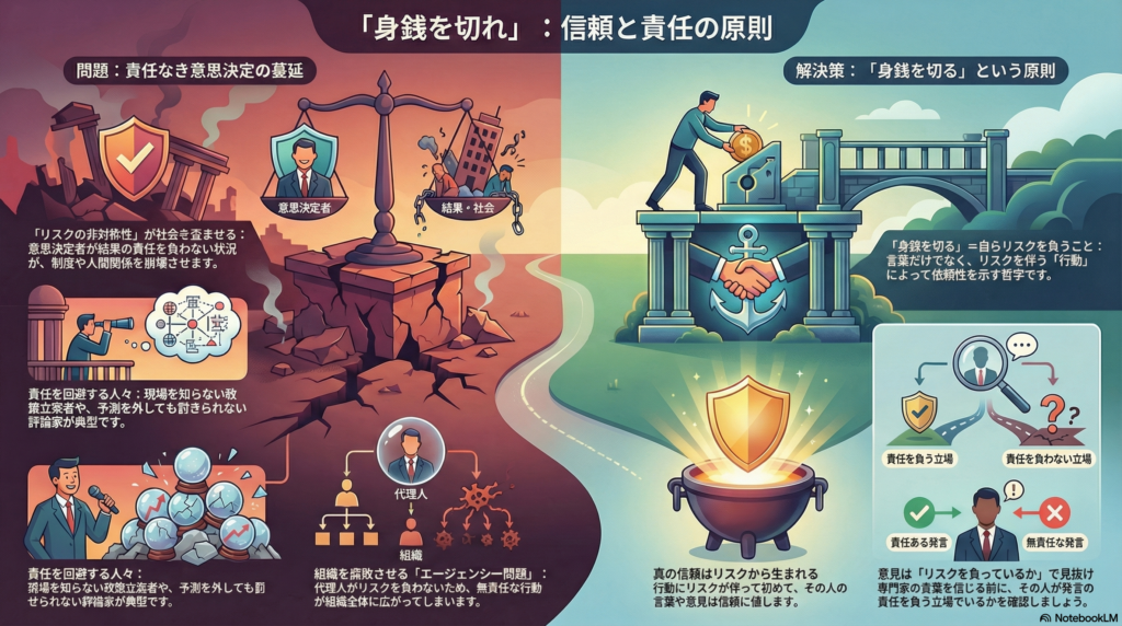とりわけ印象的だったのは、「自らがリスクを負わずに他人に影響を与える者は信用に値しない」という指摘です。これはSNSでの発言、企業での意思決定、政治家の公約に至るまで、私たちの日常すべてに当てはまります。