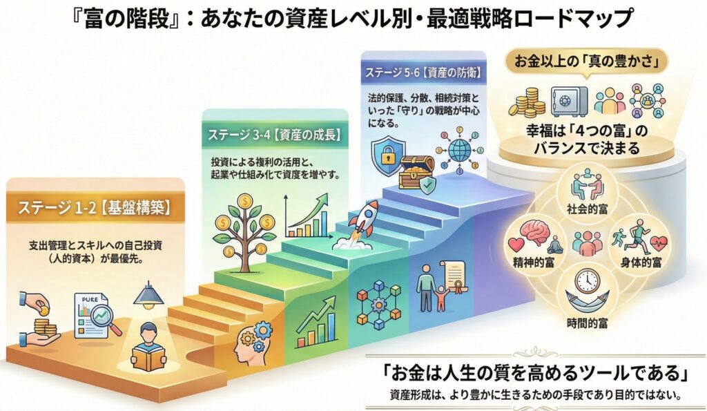 本書の最大の特徴は、「富の階段(Wealth Ladder)」と呼ばれる6段階の資産レベル別フレームワークを軸に、個人のステージに応じた最適な戦略を提示している点です。たとえば、資産がほとんどないレベル1では支出管理と心理的安定が重要ですが、レベル3(資産1,000万円〜1億円)では投資の継続性とリスクマネジメントが中心となります。そして、レベル5〜6ともなると、事業拡大や資産防衛の専門的な知見が必要になります。